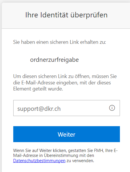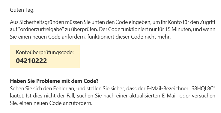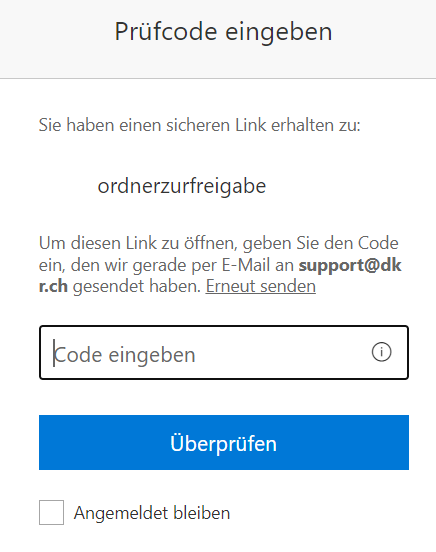Danach erhält der Empfänger einen Einmalcode auf seine Email Adresse zugestellt, welchen er hier eingeben muss. | |