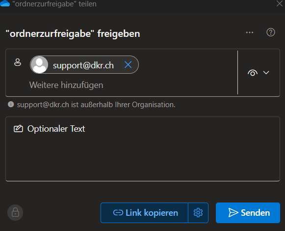 Es kann ein optionaler Text zur Einladung zugefügt werden oder per "Link kopieren" der Link in eine schon bestehende Email integriert werden.