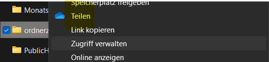 Den Ordner markieren und mit der Rechten Maustaste die Funktion "Teilen" ausführen. Die Funktion "Teilen" befindet sich im Windows 11 in den weiteren Optionen.